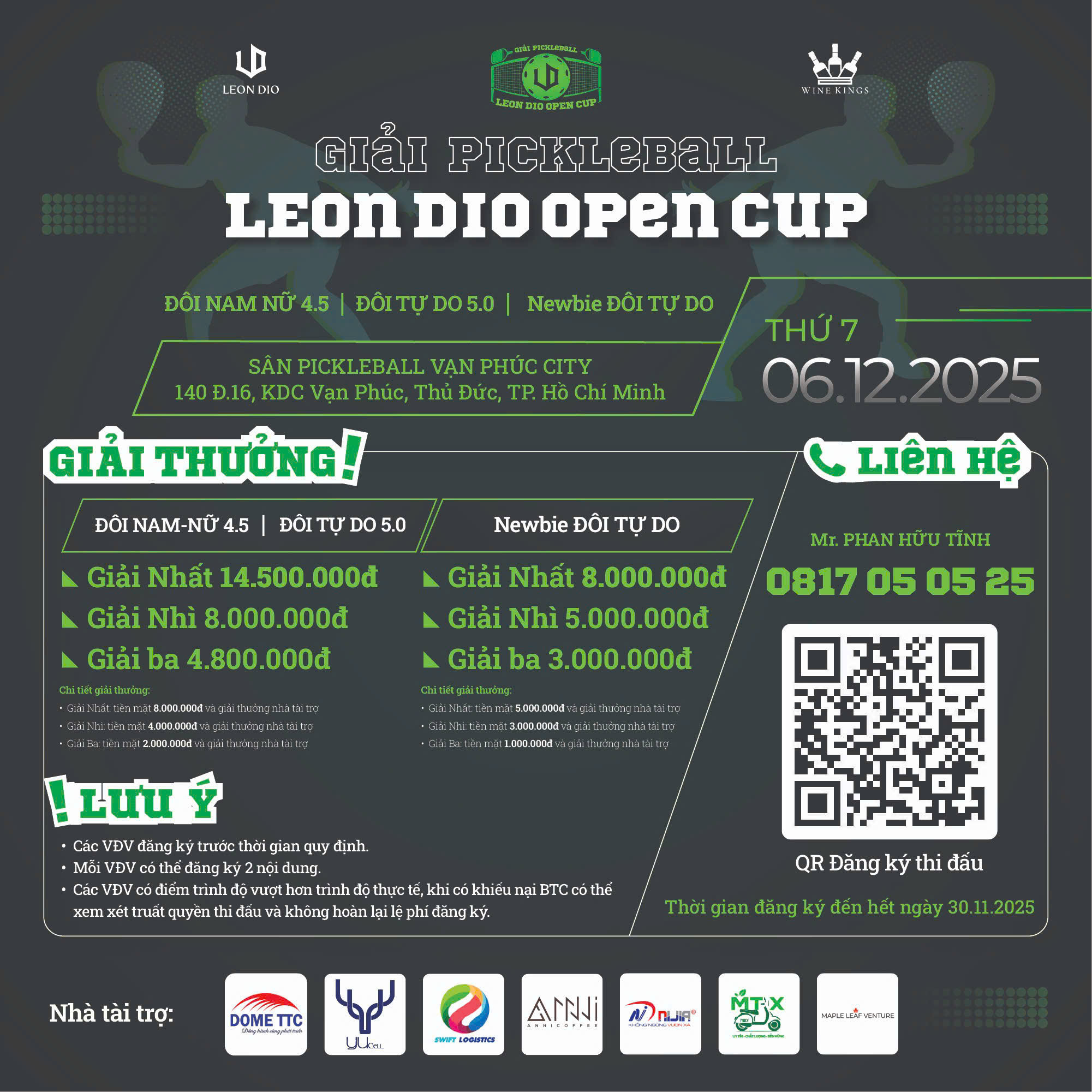 GIẢI PICKLEBALL - LEON DIO OPEN CUP 🌞Thời gian: Thứ 7, ngày 06.12.2025 📍 Địa điểm: - Cụm sân: Vạn Phúc City Pickleball - Địa chỉ: KĐT Vạn Phúc - 375 Quốc lộ 13, P.Hiệp Bình, TP.HCM ** Điện thoại liên hệ: 0817 050525 (Mr. Tính) - Để giải đấu mang lại cho bạn một trải nghiệm pickleball tuyệt vời, hãy dành chút thời gian cung cấp đầy đủ thông tin quan trọng dưới đây: * Danh sách VĐV đăng ký sẽ được cập nhật hàng ngày sẽ được công bố trong bài thông báo tới các VĐV thông qua fanpage giải đấu.